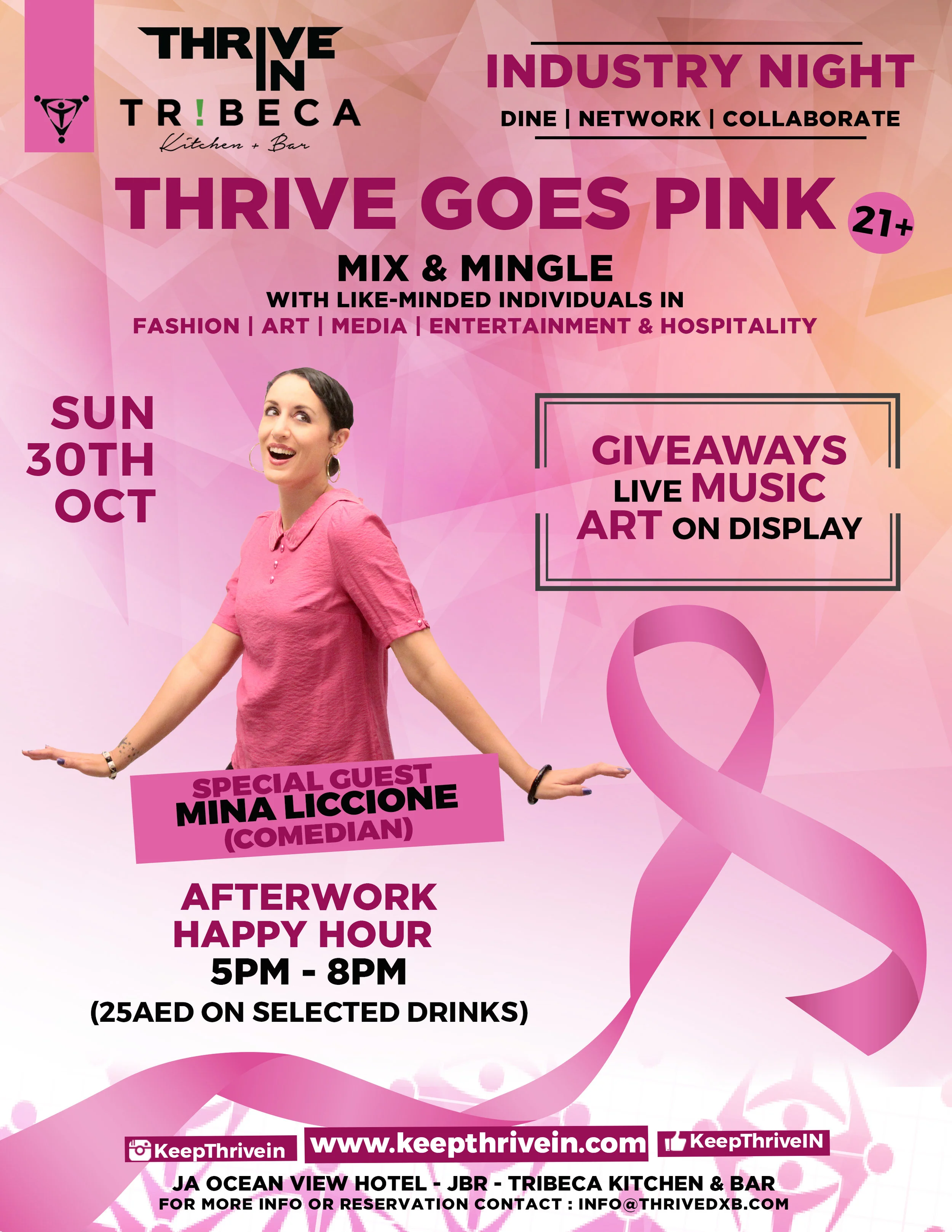 Join us on the 30th of October at Tribeca Kitchen and Bar, JA Ocean View Hotel JBR for our Thrive Goes Pink event featuring the amazing and award winning comedian Mina Liccione.